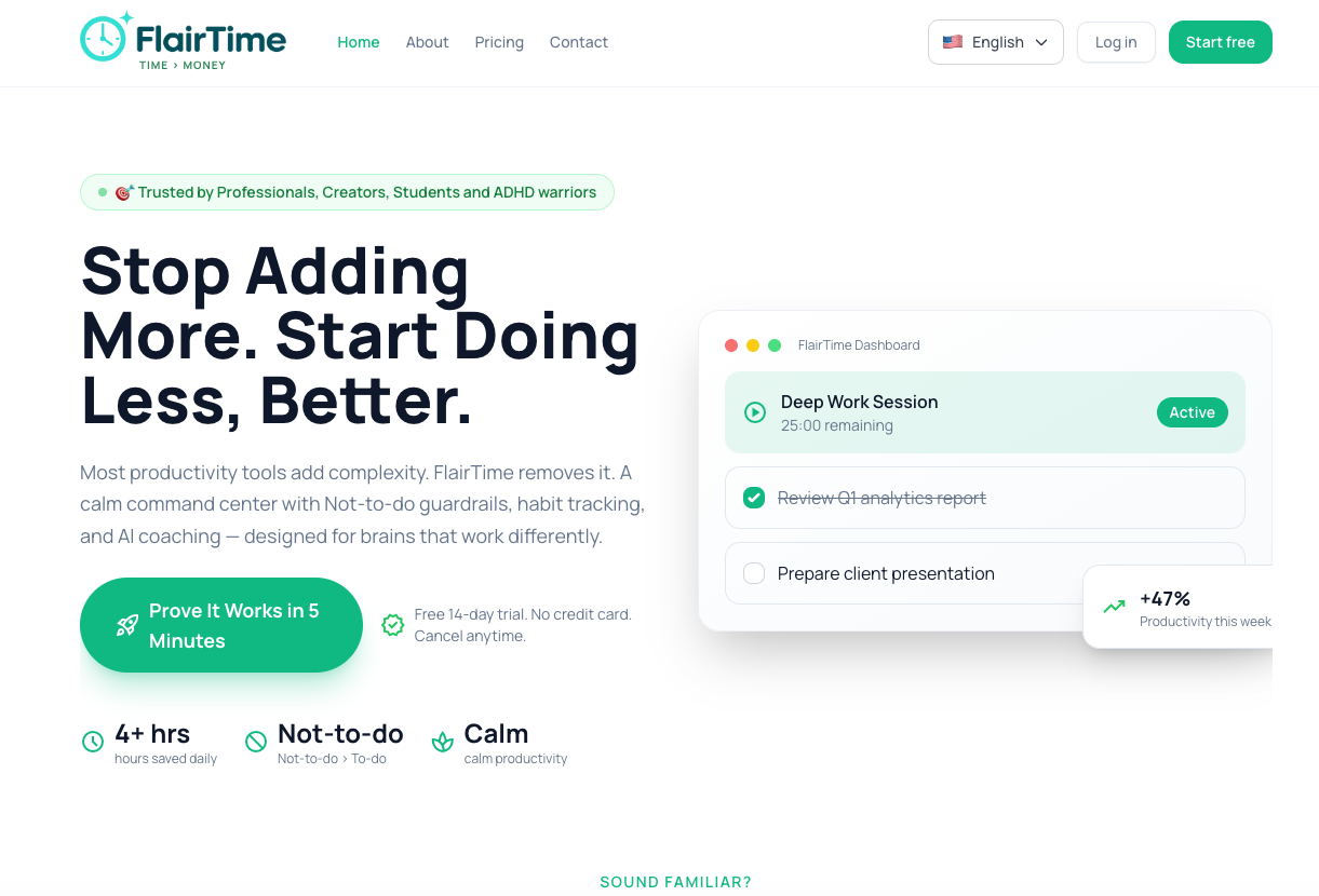Absolutely. FlairTime was built with ADHD minds in focus. The Not-to-do guardrails, visual timers, and proactive reminders provide the external structure that helps you stay on track without relying on willpower alone.